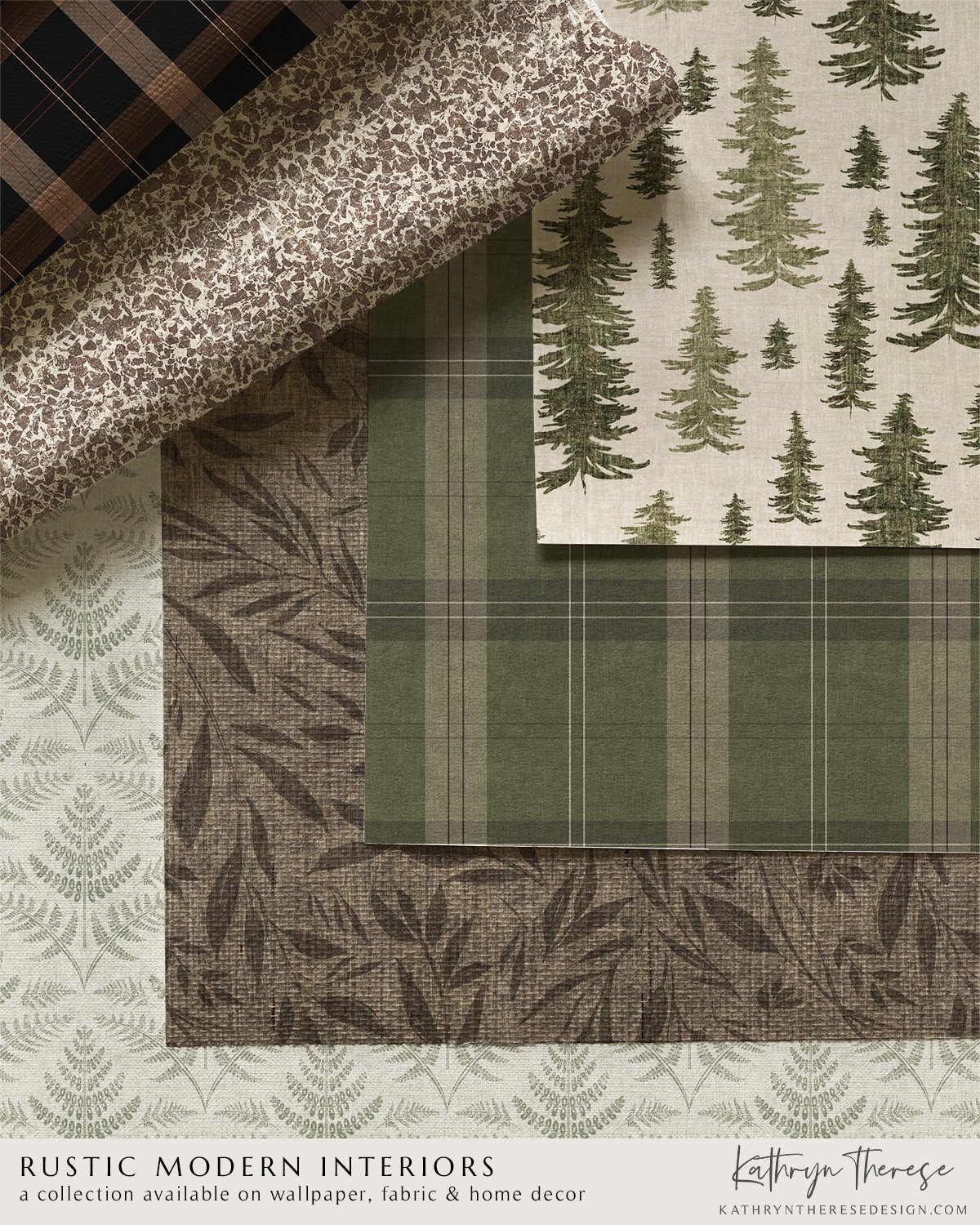 Inspired by woodland retreats and mountain lodges, these cabincore and modern rustic designs feature forest botanicals, earthy plaids, and textured neutrals. These wallpaper and fabric patterns are designed for grounded, design-forward spaces, adding depth to modern cabins, curated open-concept homes, and interiors that embrace both warmth and simplicity. Available for art licensing and rustic home collaborations.