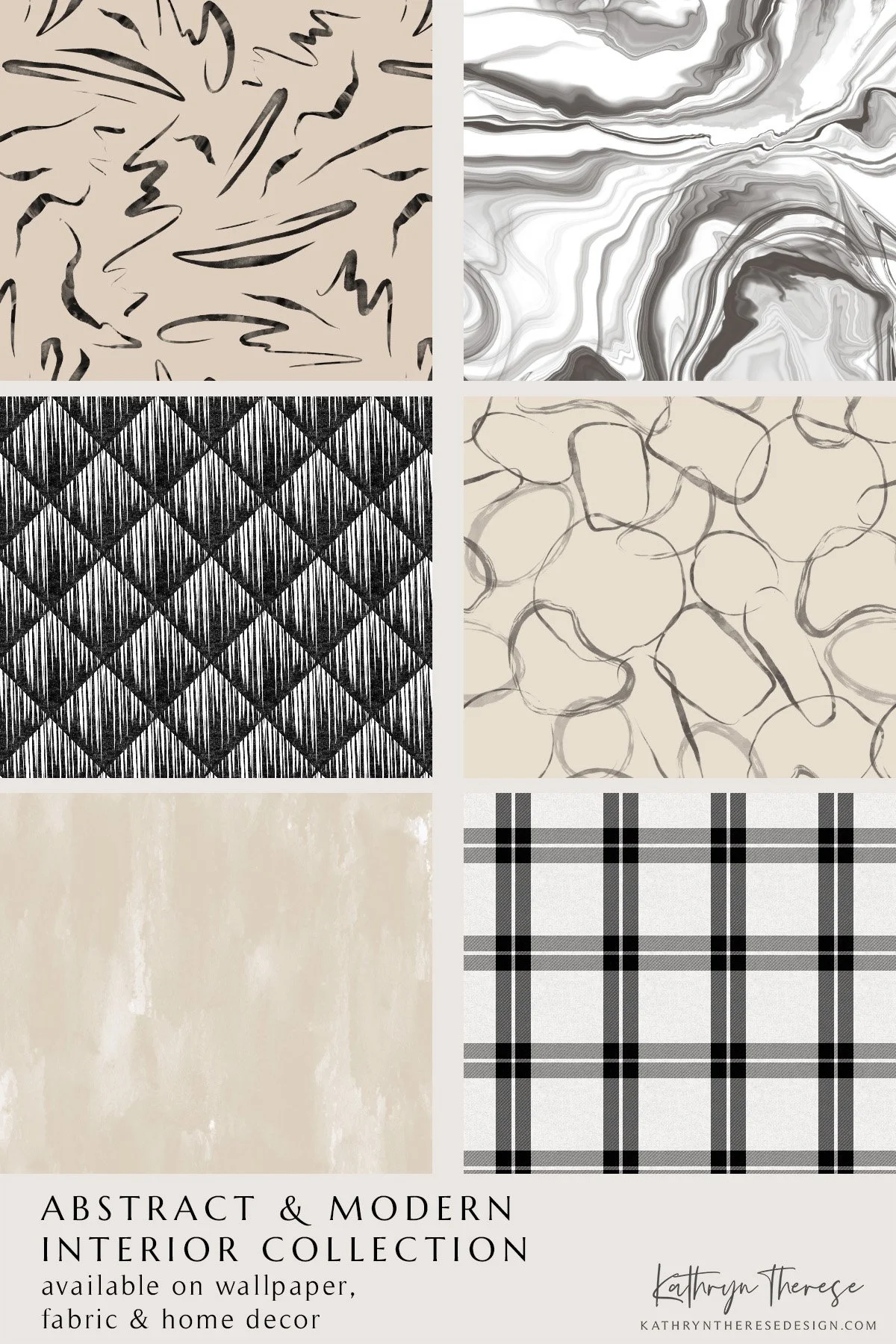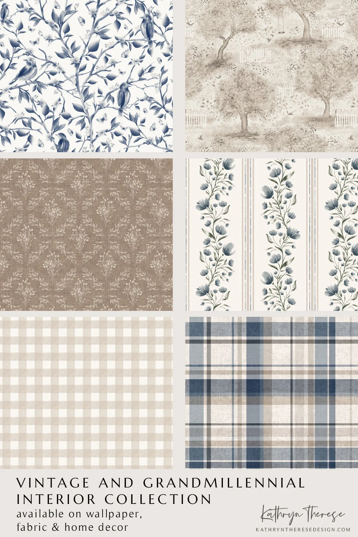 Curated pattern collections inspired by popular home aesthetics like farmhouse, moody modern, and floral cottage interiors.