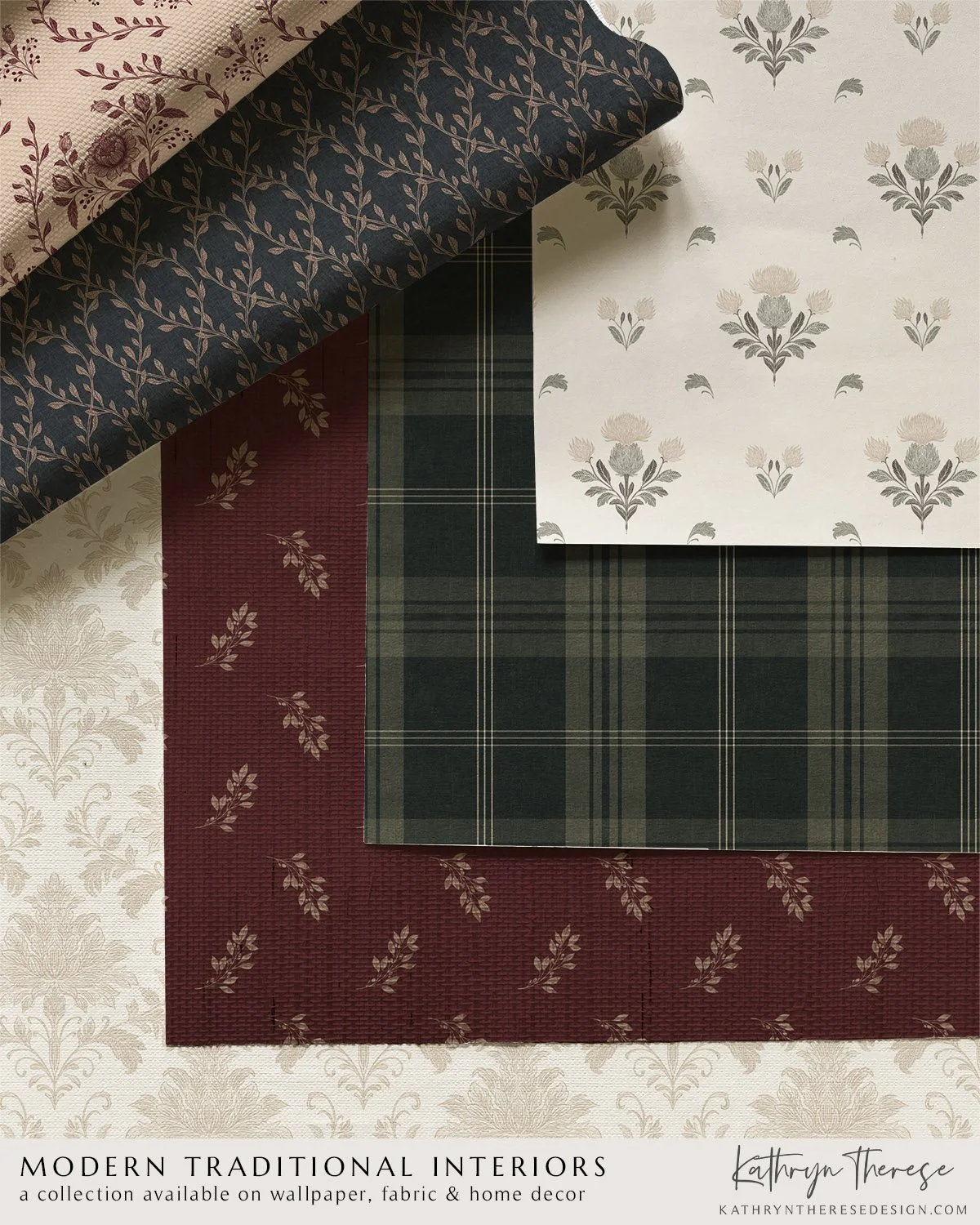 Classic design meets a fresh point of view in this modern traditional collection, where historic pattern influences are reimagined through updated color, scale, and richly textured artwork. These sophisticated wallpaper and fabric designs are created for layered interiors, from formal dining rooms to tailored primary suites; offering a refined foundation for designers and homeowners seeking timeless style with a contemporary edge. Available for art licensing and home decor collaborations that capture rustic elegance.